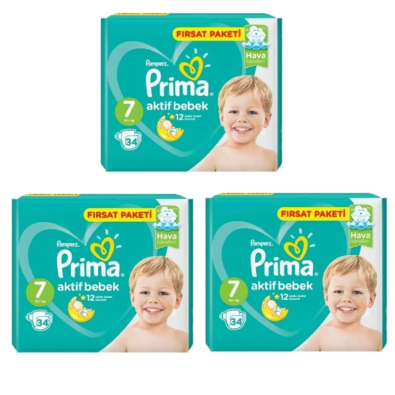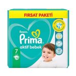 پوشک پریما سایز 7 برای کودکان با وزن +15 کیلوگرم مناسب است. این پوشک پریما ساخت کشور ترکیه مدل Aktif bebek به معنای Active baby و یا کودک فعال است و مناسب دلبند پرجنب و جوش و شاداب شما است. این نوع پوشک با دارابودن تاییدیه پوست ازموسسه سلامت پوست انگلستان (Skin Health Alliance) فاقد پارابن بوده و بالاترین الزامات پوستی متناسب با پوست حساس فرزند شما را برآورده می سازد. کانال های هوای تعبیه شده در این پوشک با ایجاد گردش هوای مستر در اطراف پوست کودک شما باعث ایجاد احساس خشکی و جلوگیری از آسیب های پوستی در کودکان می شود. لایه داخلی با دارا بودن ذرات مرواریدی شکل رطوبت را جذب کرده و تا 12 ساعت در خود نگه میدارد بنابراین می توانید از این پوشک در طول شب، بدون نیاز به تعویض استفاده کرده و خواب راحت و آرامی را برای کودک رقم بزنید. همچنین یک لایه خشک اضافه در سطح رویی نیز رطوبت و آلودگی را از پوست حساس کودک دور نگه می‌دارد. این پوشک بسیار نرم و لطیف بوده و احساس راحتی فوق العاده ای ایجاد می کند نوارهای جانبی نرم و کشسان دو طرف پوشک نیز باعث می‌شود علی‌رغم تحرک فرزند شماْ پوشک در جای خود ثابت بماند.